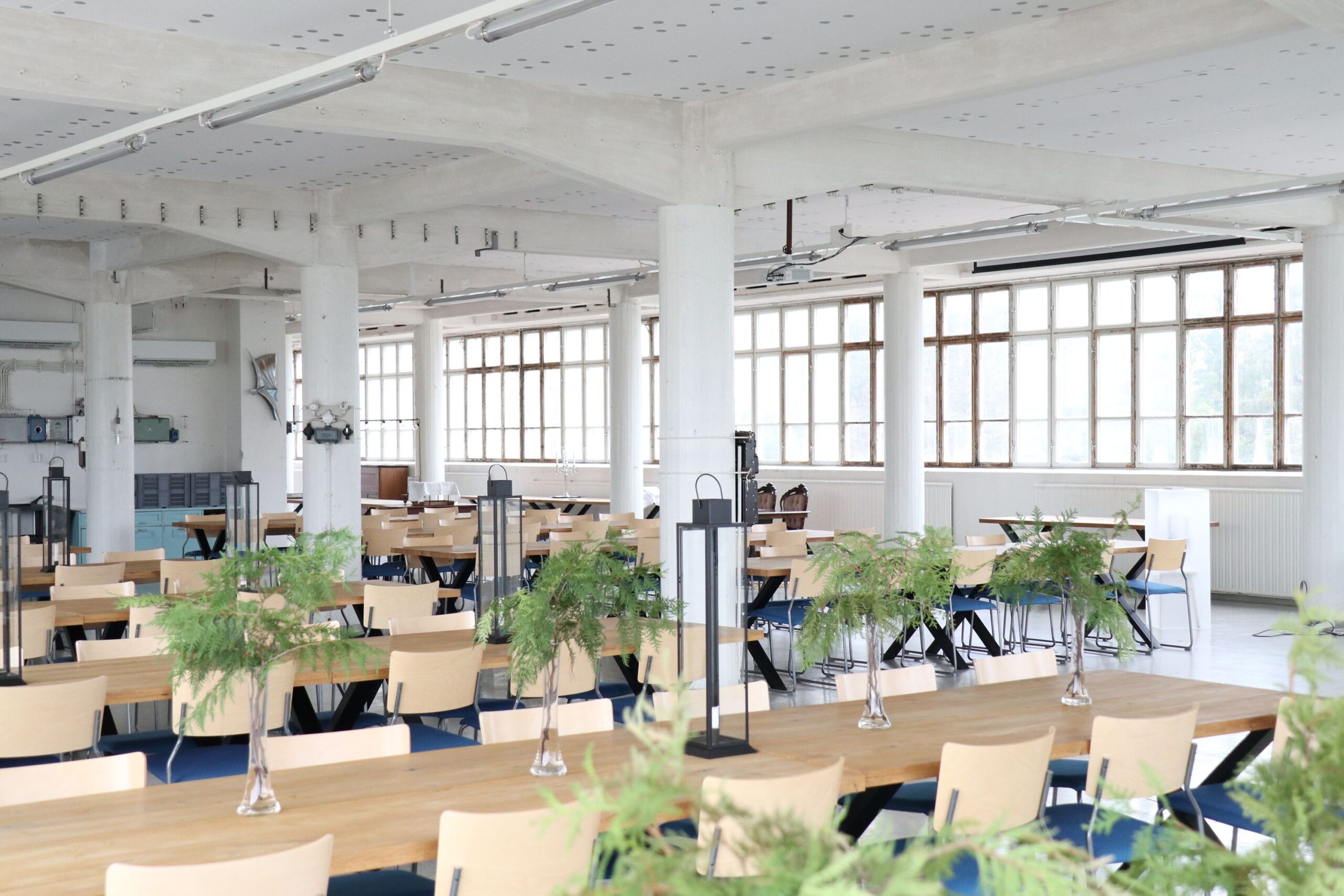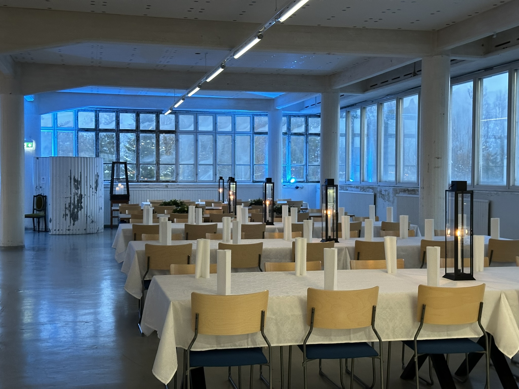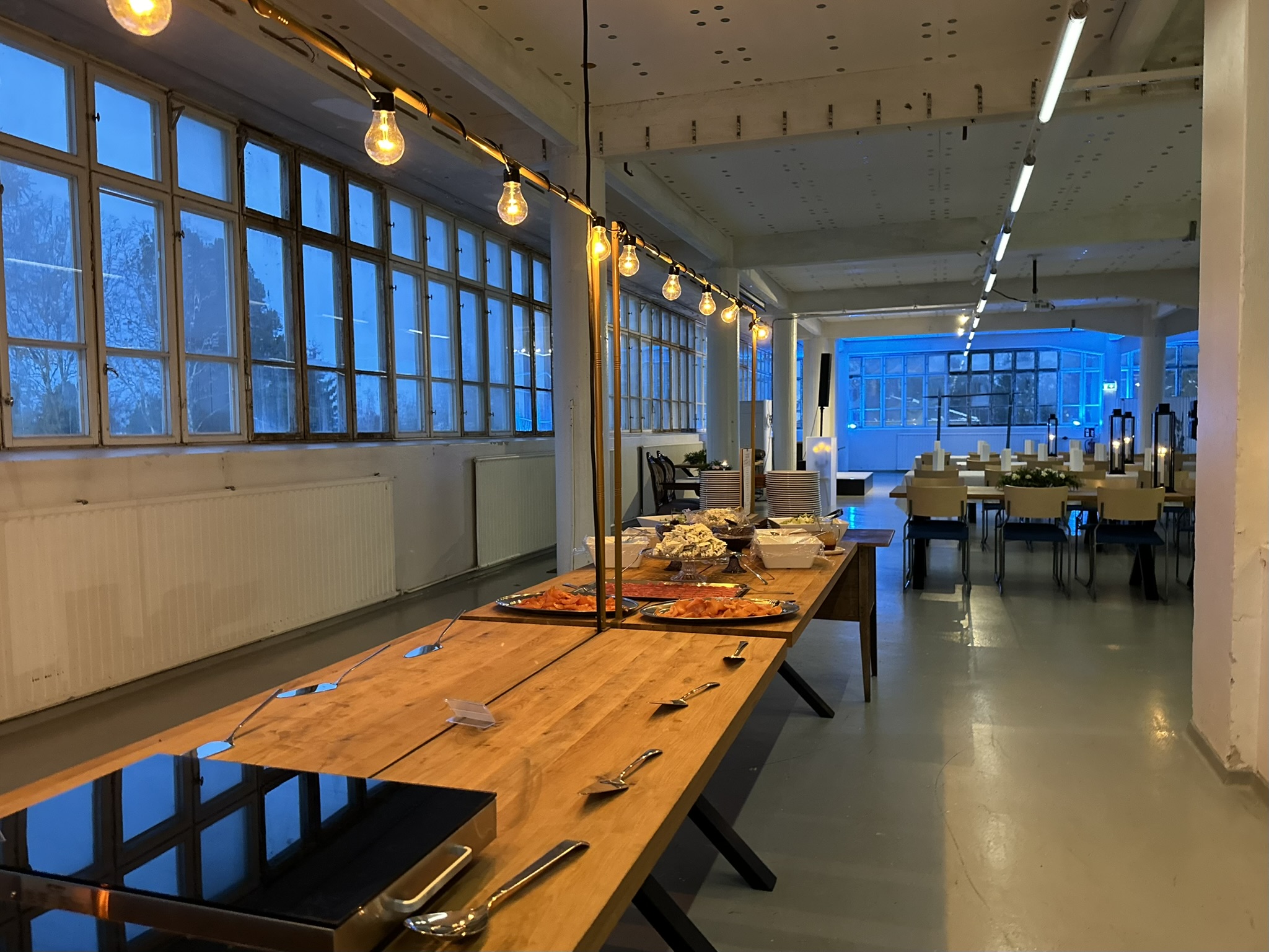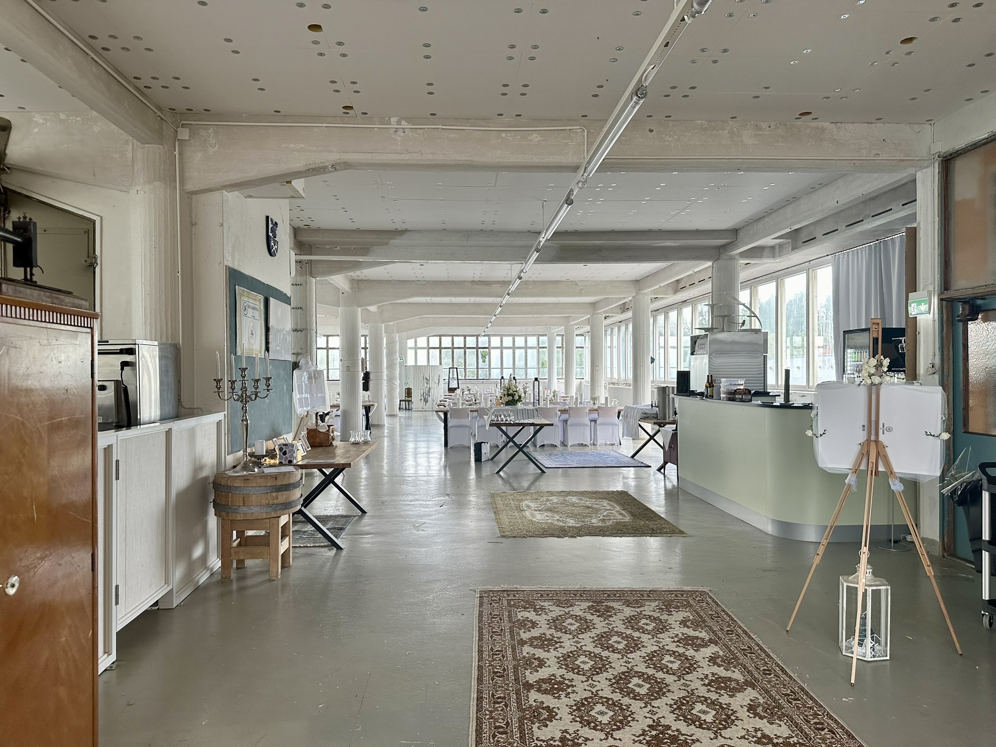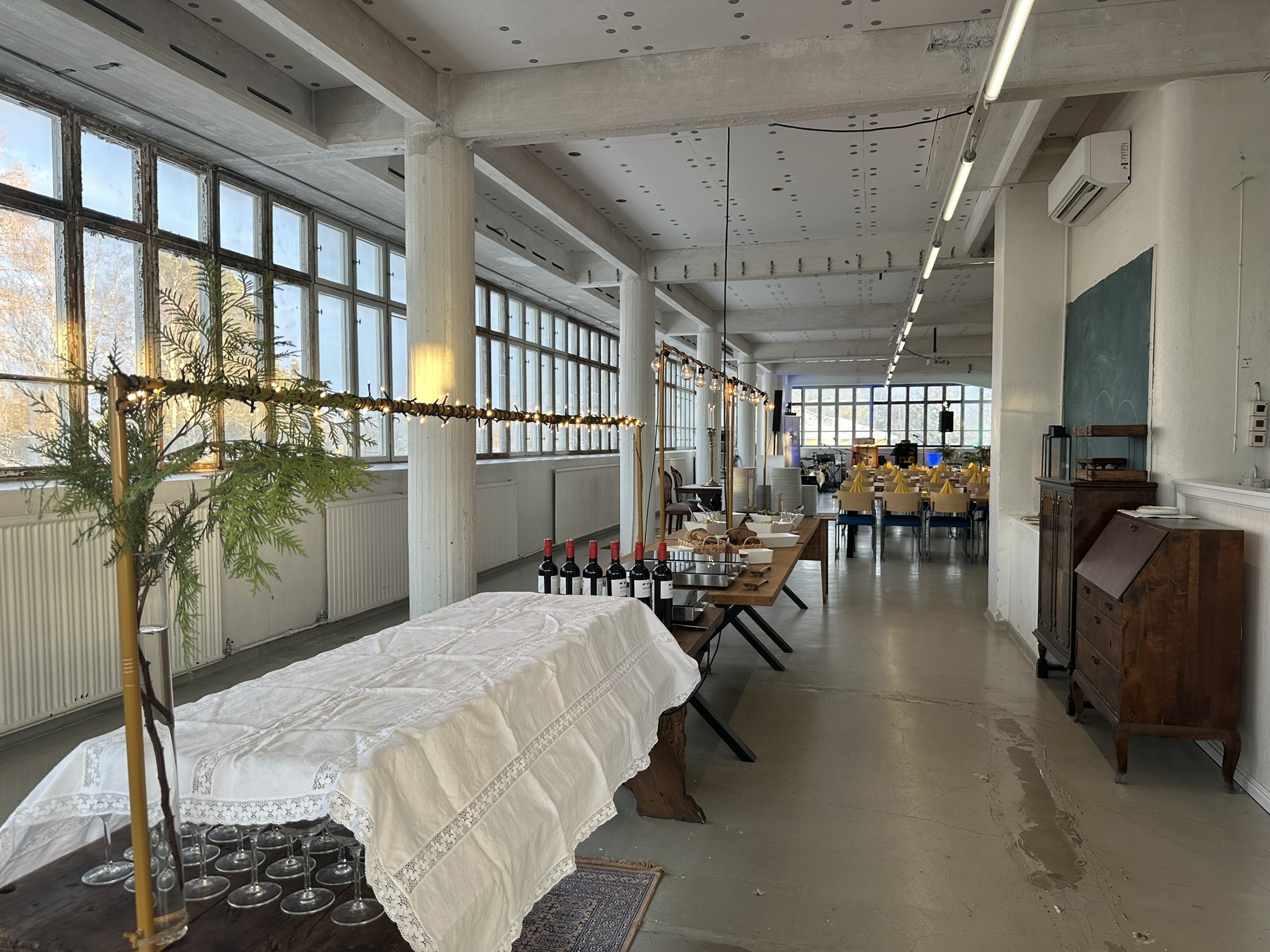 Salissa voi juhlia kerralla 180 henkeä, mutta mikään ei estä järjestämästä henkilömäärältään isojakin juhlia niin että juhlijat saapuvat taloon 2-3 erässä. Toisaalta valoa ja avaruutta tuovan ikkunarivistön ansiosta miljöössä viihtyy hyvin pienetkin, esim. 20 hengen seurueet. Yhtenäisen tilan (ei väliseiniä) ansiosta suurikin juhlaseurue on samassa tilassa. Tässä autenttisessa tehdasmiljöössä järjestät niin kokoukset, häät, muistotilaisuudet, pikkujoulut, syntymäpäivät tai mitkä vaan pienet taikka suuret tilaisuudet.