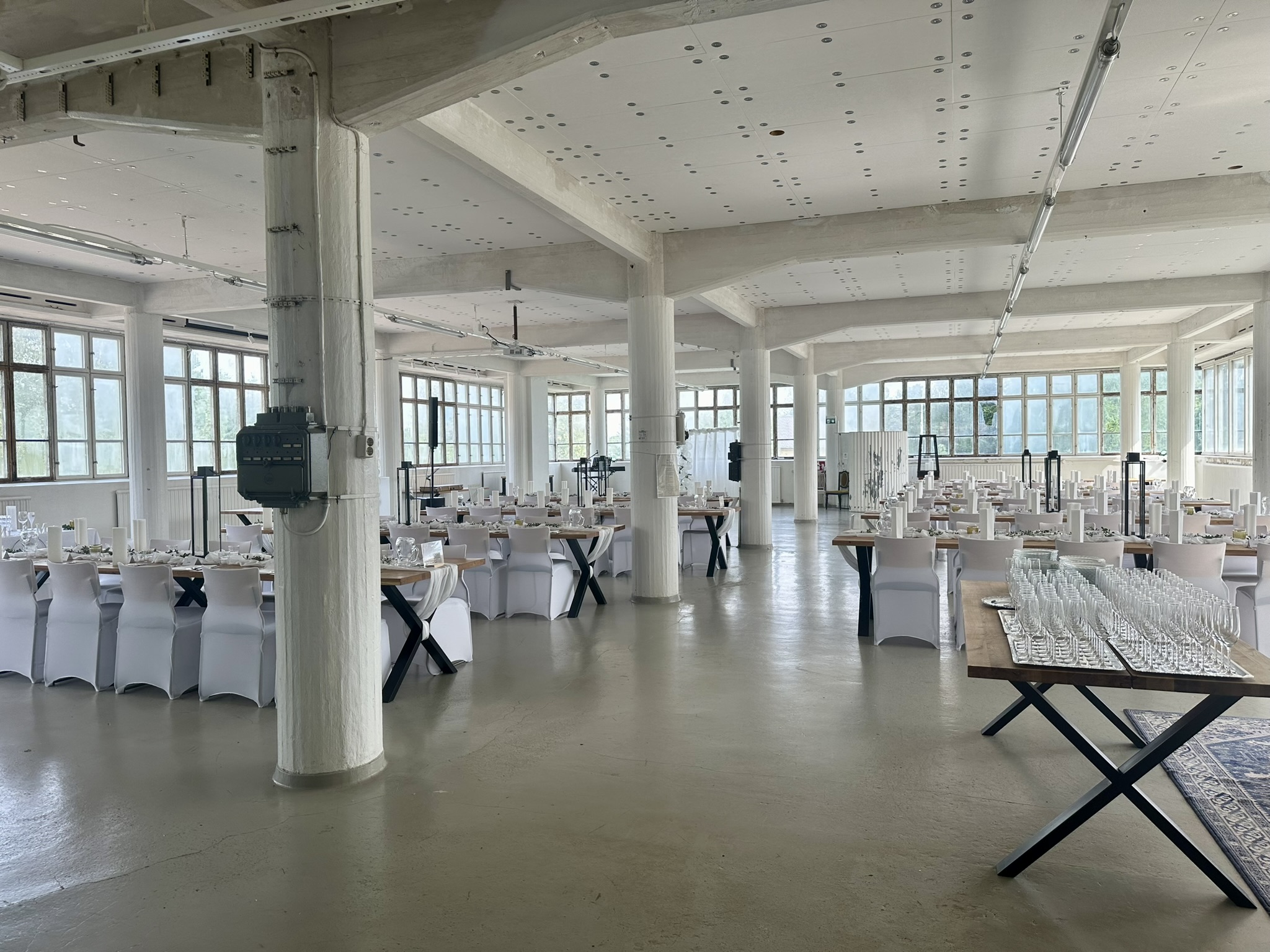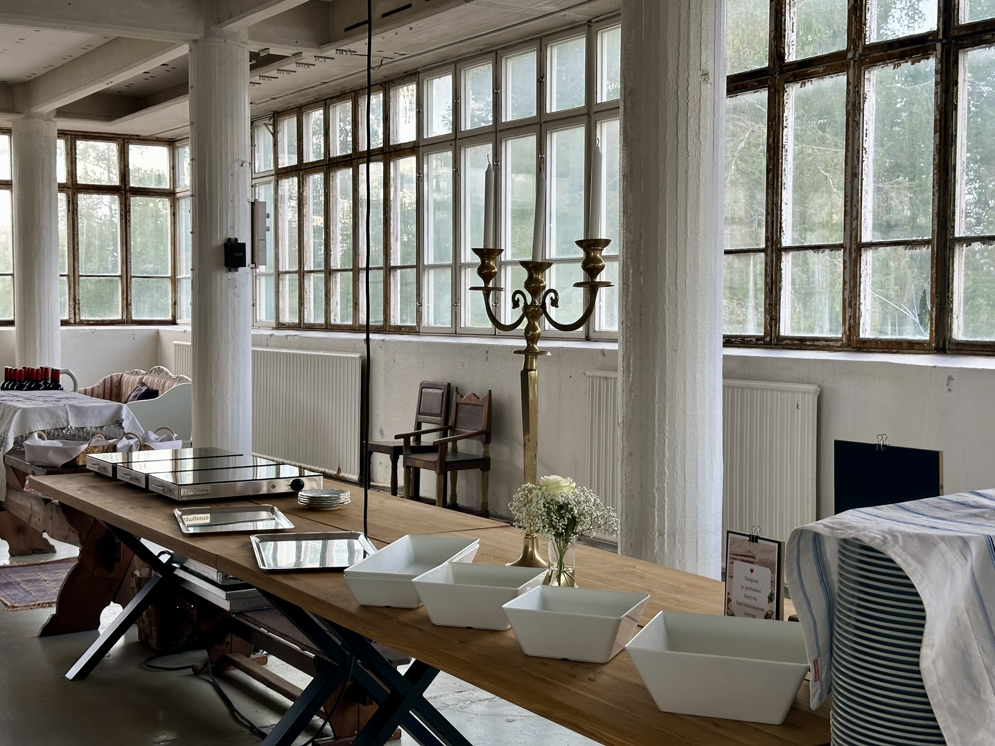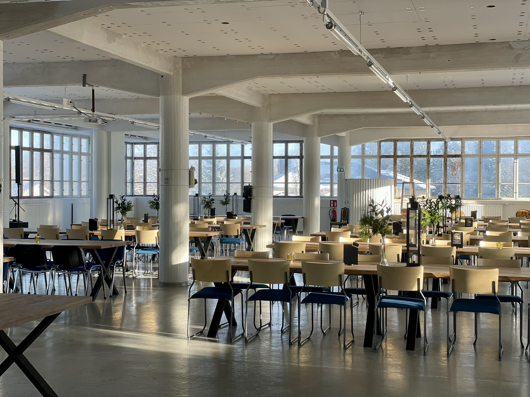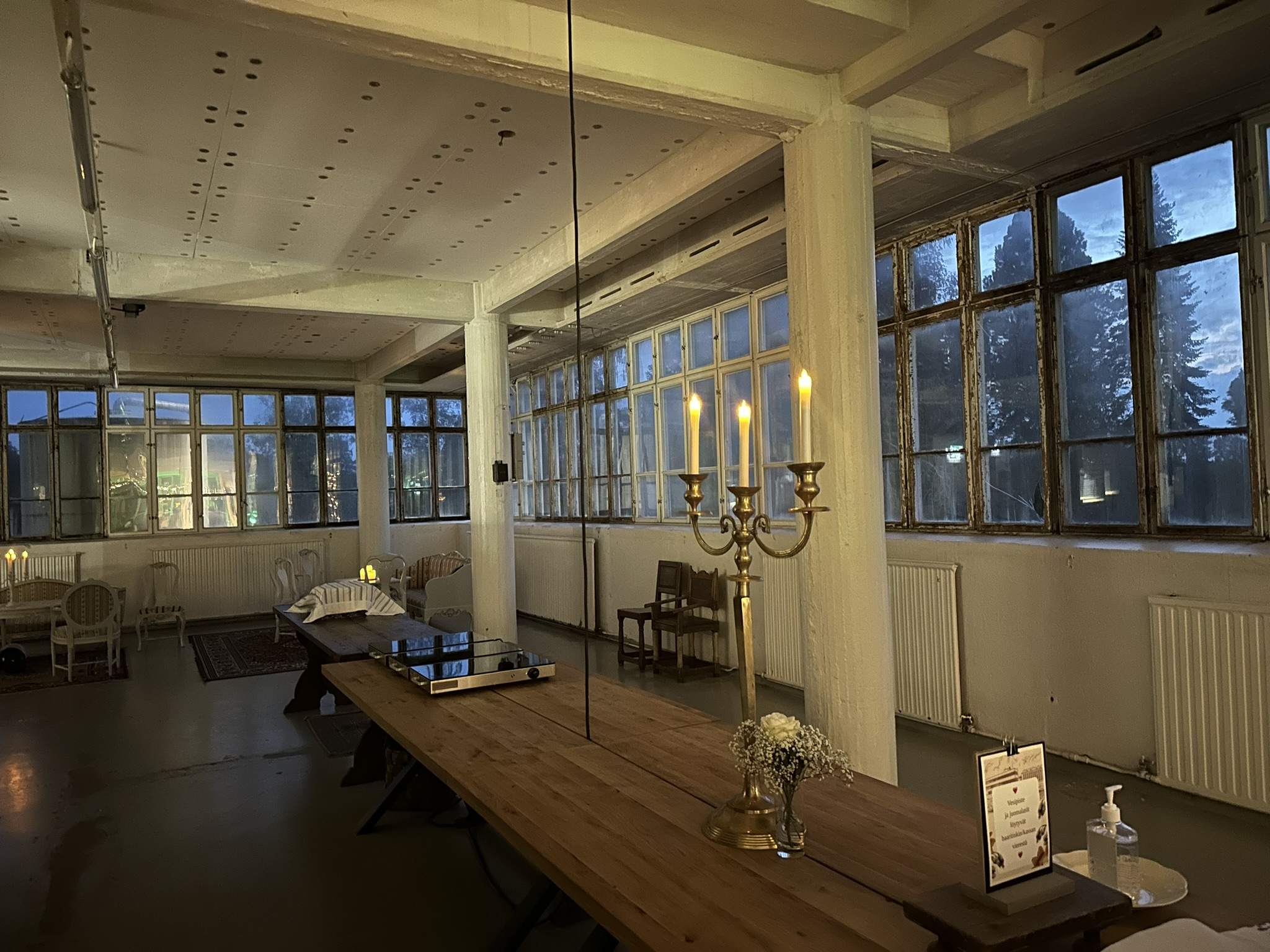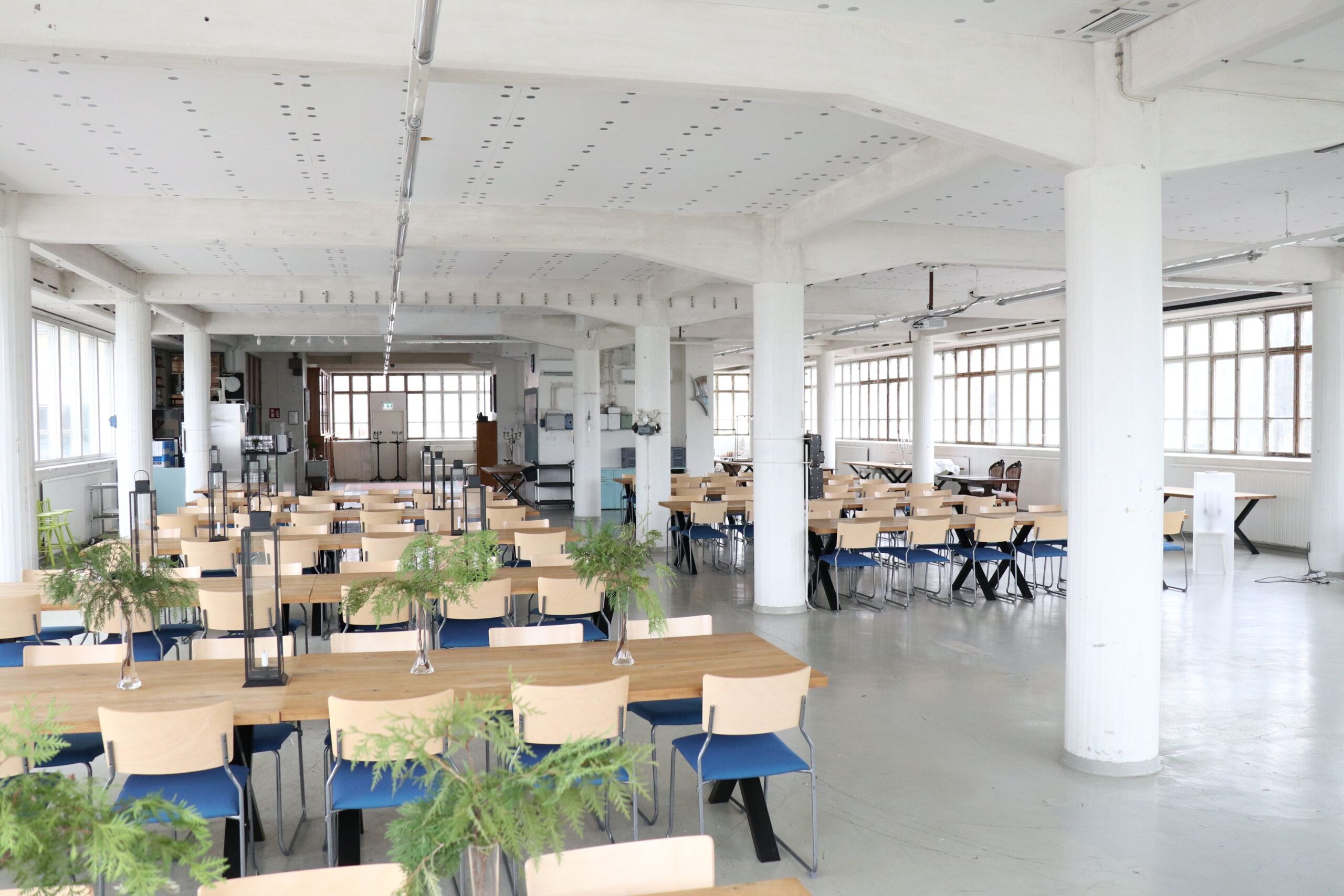 Salissa voi juhlia kerralla 180 henkeä, mutta mikään ei estä järjestämästä henkilömäärältään isojakin juhlia niin että juhlijat saapuvat taloon 2-3 erässä. Toisaalta valoa ja avaruutta tuovan ikkunarivistön ansiosta miljöössä viihtyy hyvin pienetkin, esim. 20 hengen seurueet. Yhtenäisen tilan (ei väliseiniä) ansiosta suurikin juhlaseurue on samassa tilassa. Tässä autenttisessa tehdasmiljöössä järjestät niin kokoukset, häät, muistotilaisuudet, pikkujoulut, syntymäpäivät tai mitkä vaan pienet taikka suuret tilaisuudet.