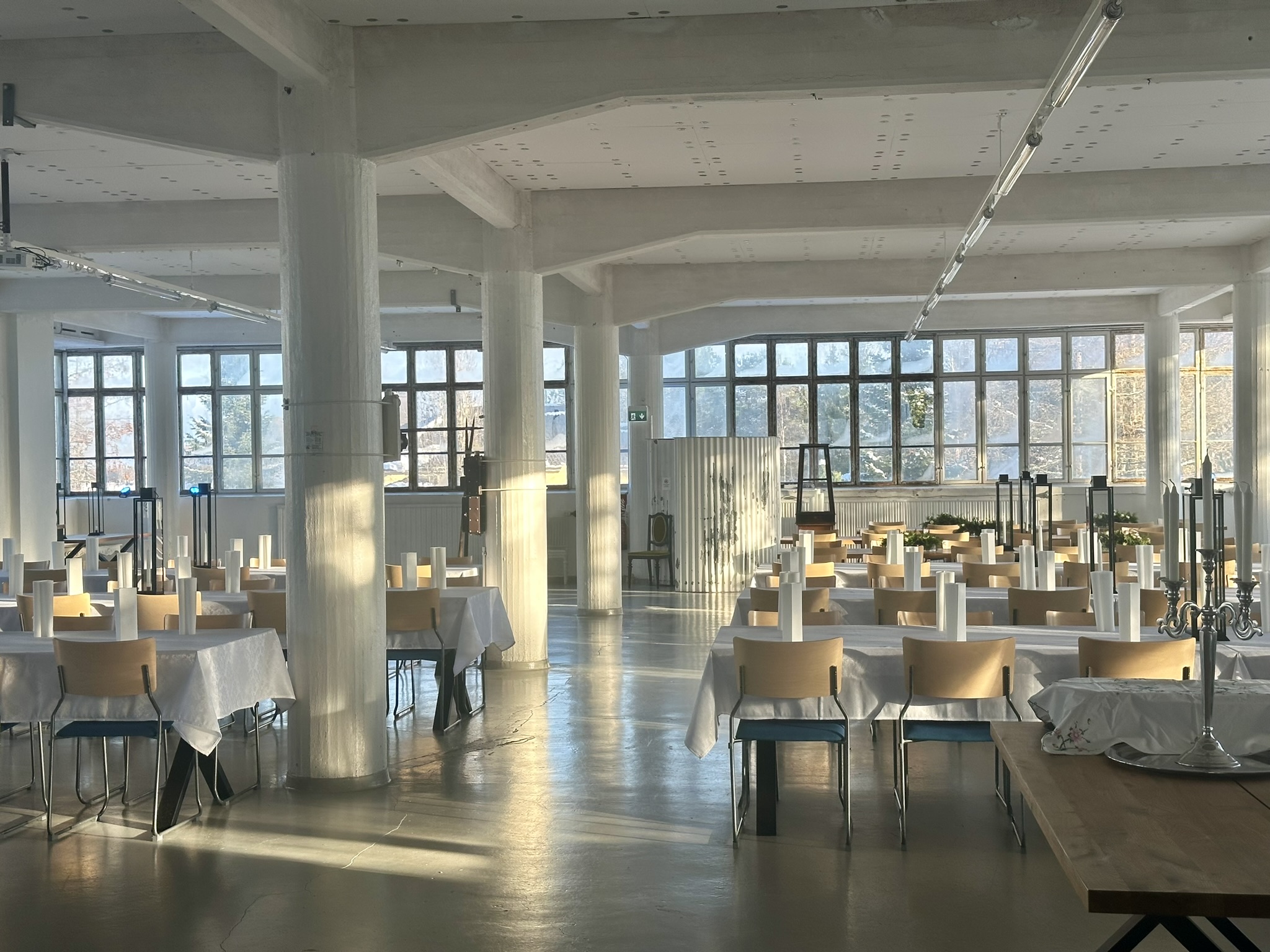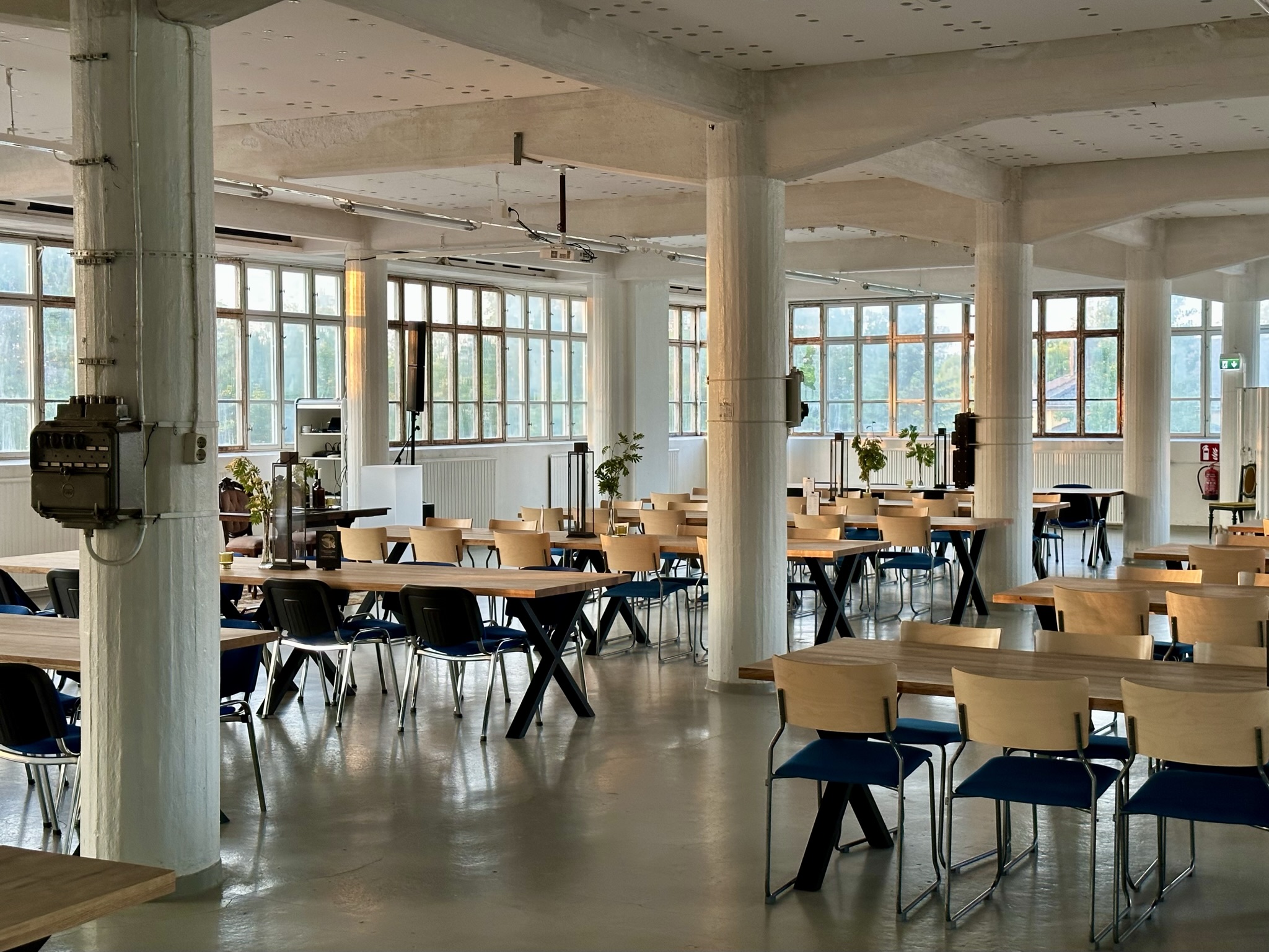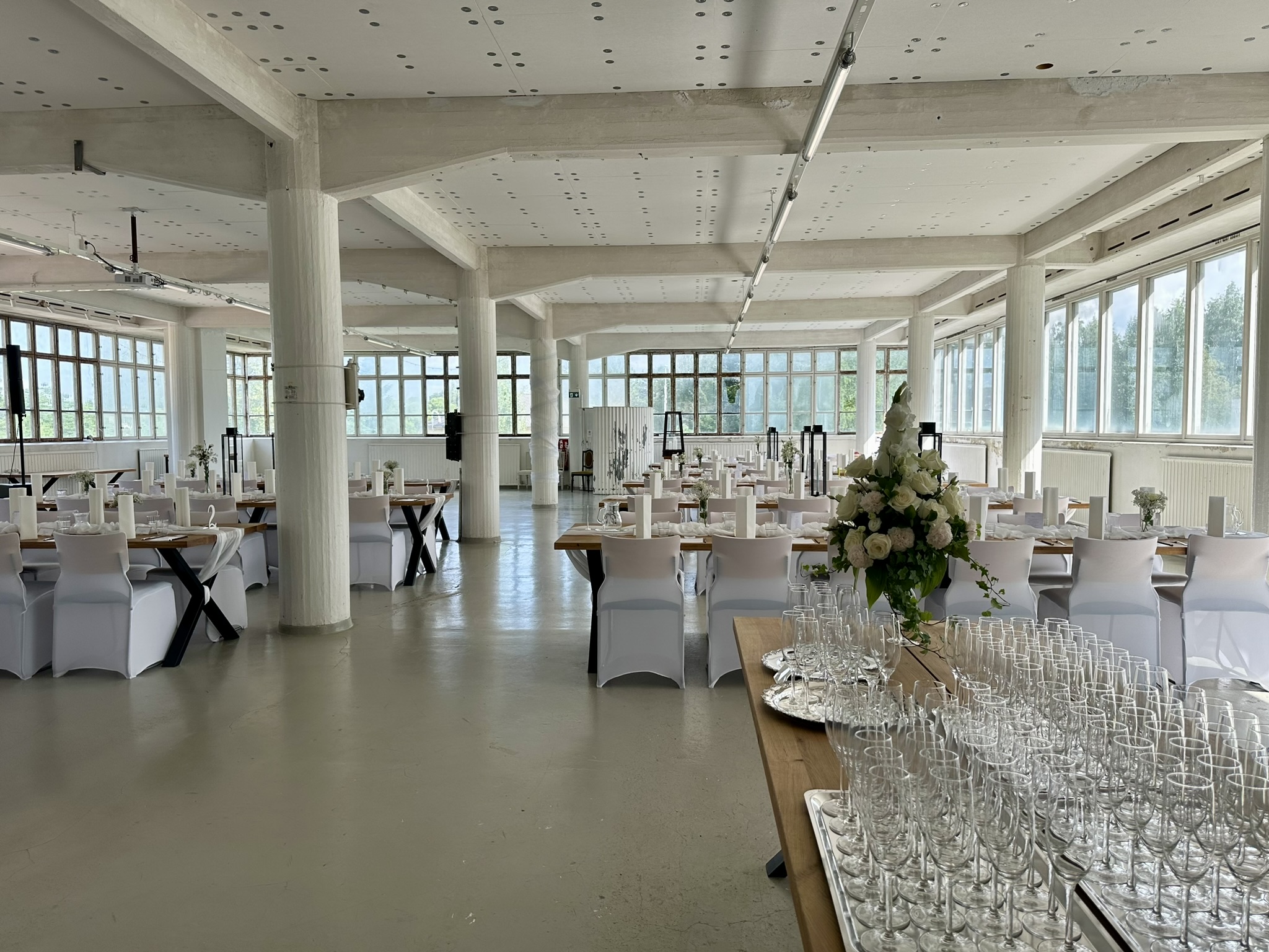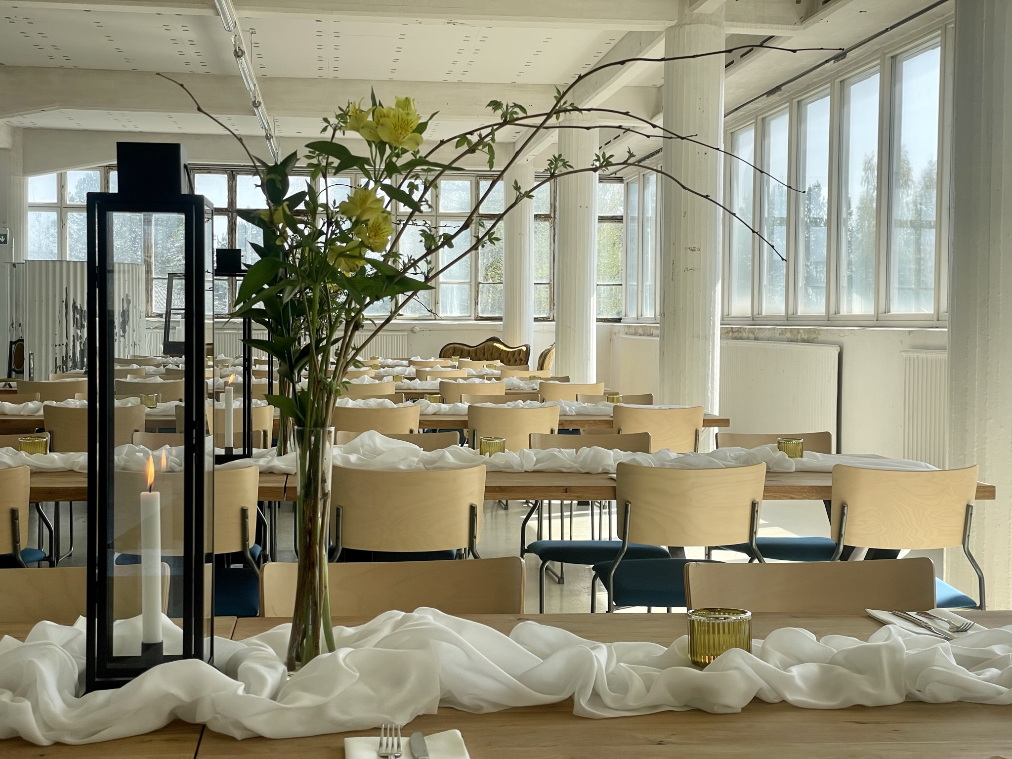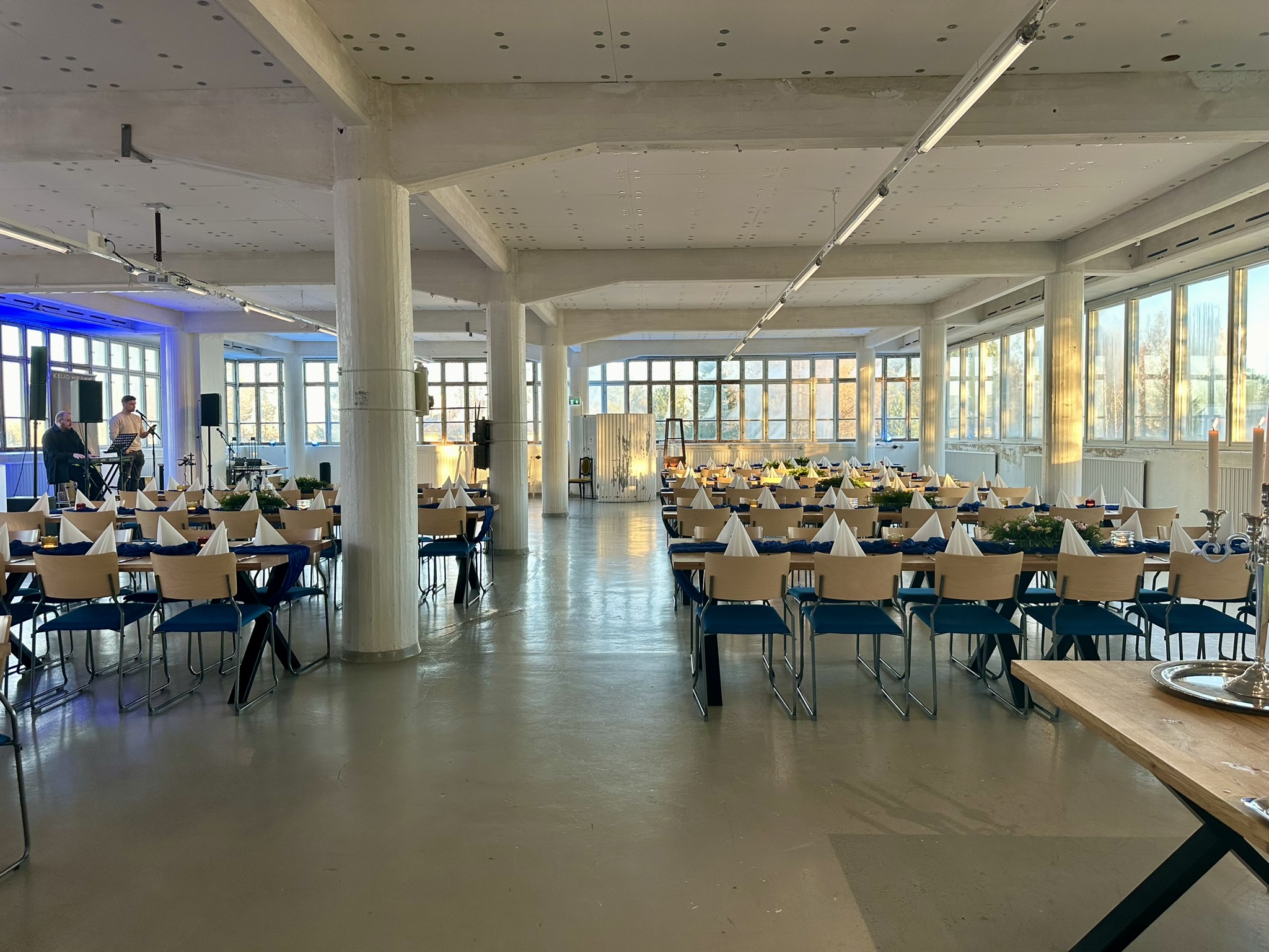 Salissa voi juhlia kerralla 180 henkeä, mutta mikään ei estä järjestämästä henkilömäärältään isojakin juhlia niin että juhlijat saapuvat taloon 2-3 erässä. Toisaalta valoa ja avaruutta tuovan ikkunarivistön ansiosta miljöössä viihtyy hyvin pienetkin, esim. 20 hengen seurueet. Yhtenäisen tilan (ei väliseiniä) ansiosta suurikin juhlaseurue on samassa tilassa. Tässä autenttisessa tehdasmiljöössä järjestät niin kokoukset, häät, muistotilaisuudet, pikkujoulut, syntymäpäivät tai mitkä vaan pienet taikka suuret tilaisuudet.