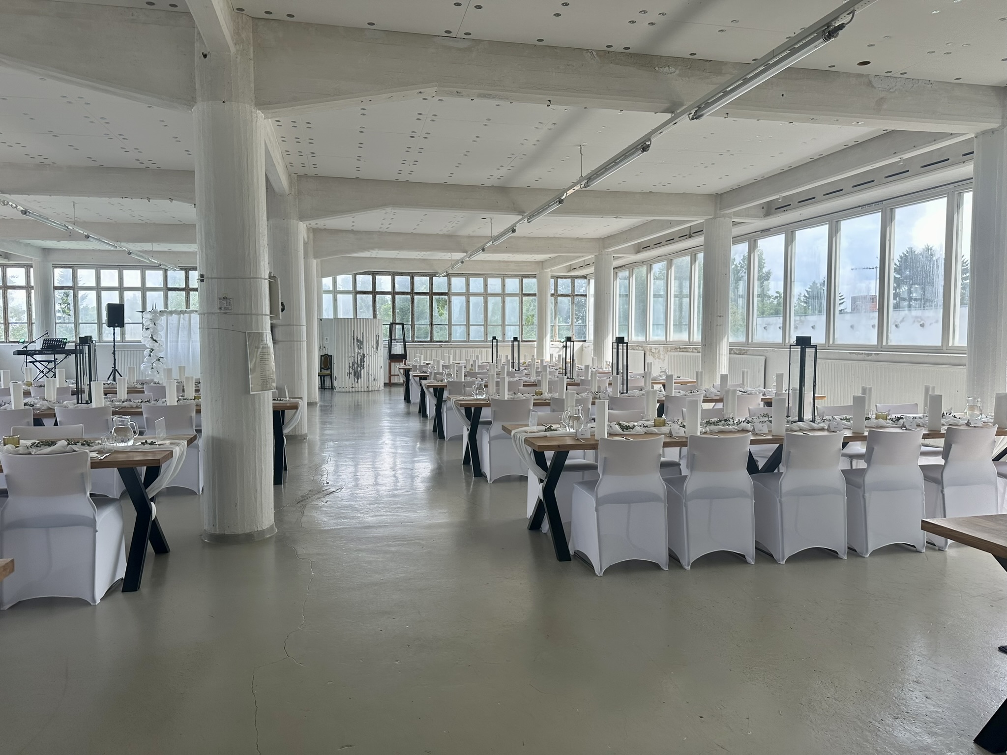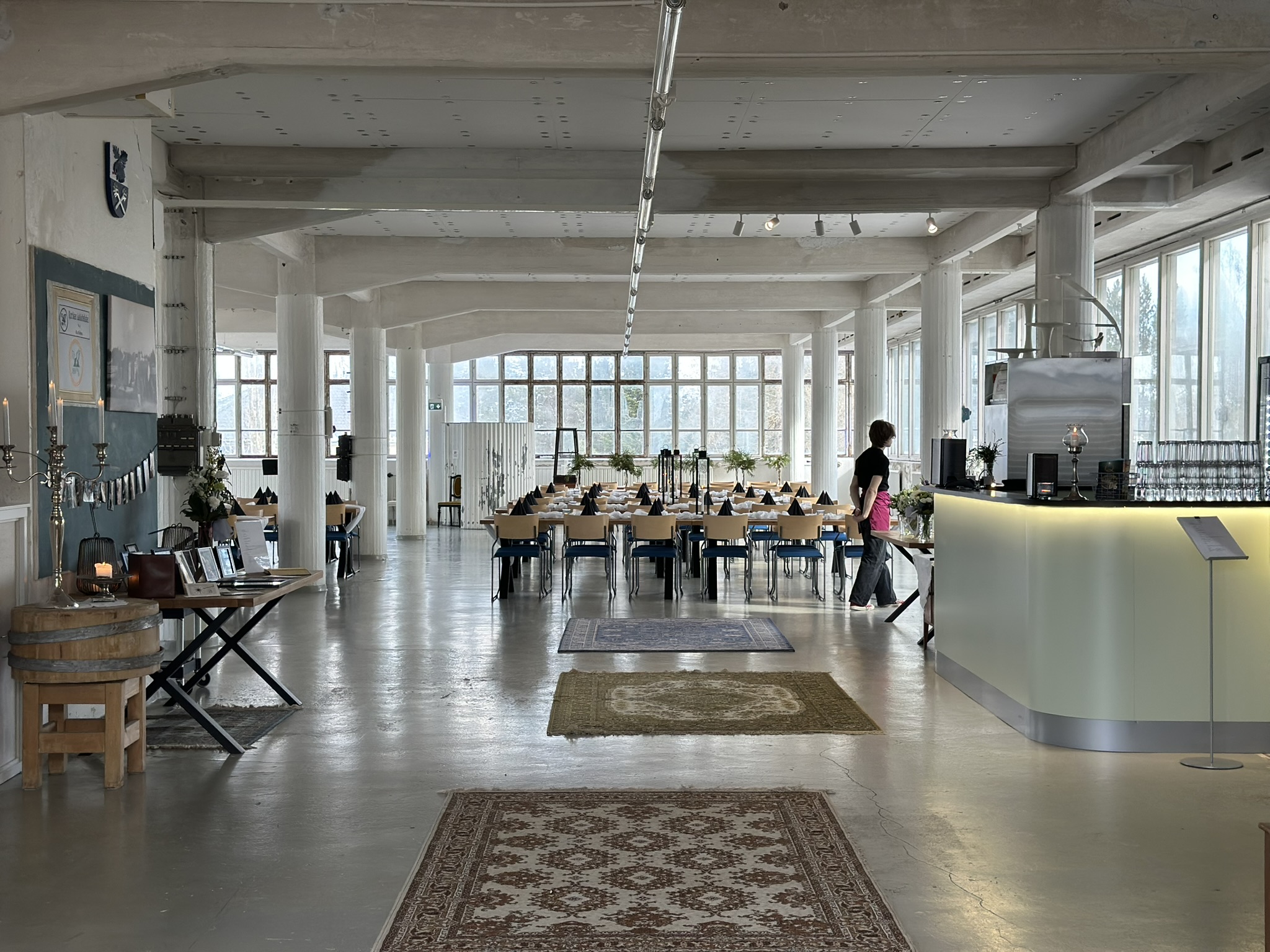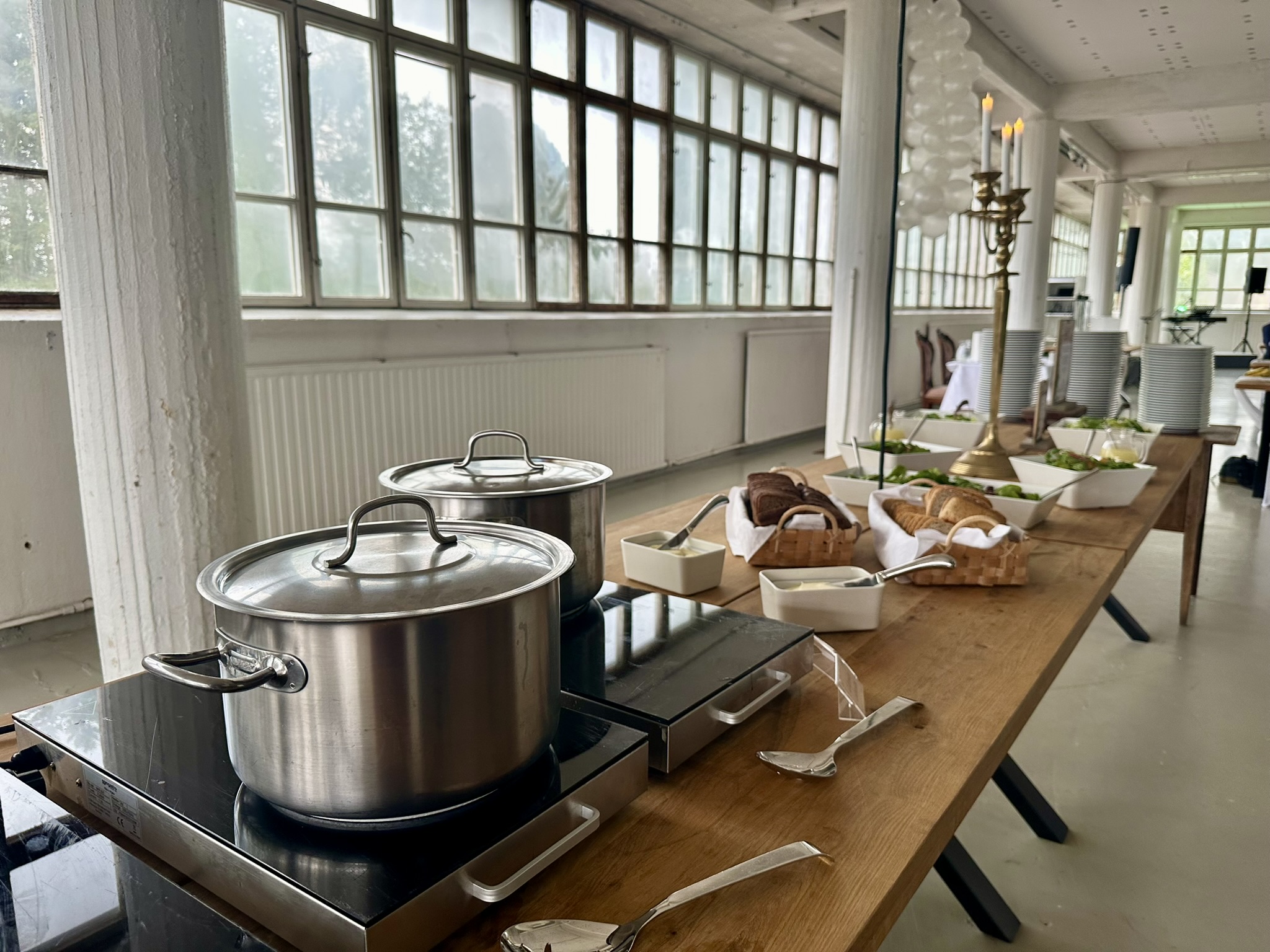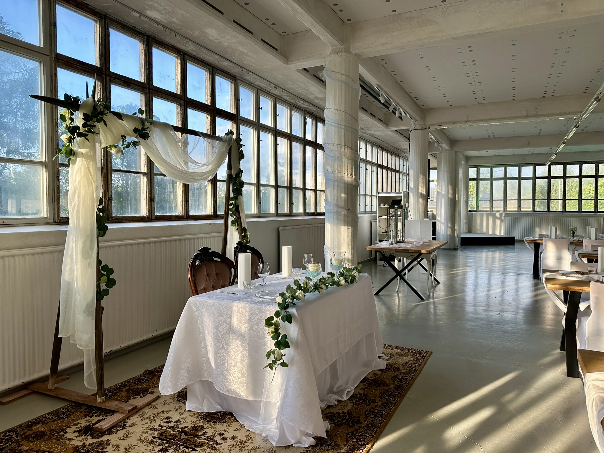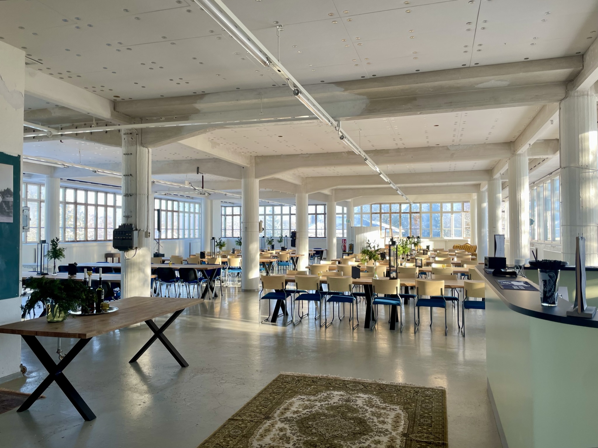 Salissa voi juhlia kerralla 180 henkeä, mutta mikään ei estä järjestämästä henkilömäärältään isojakin juhlia niin että juhlijat saapuvat taloon 2-3 erässä. Toisaalta valoa ja avaruutta tuovan ikkunarivistön ansiosta miljöössä viihtyy hyvin pienetkin, esim. 20 hengen seurueet. Yhtenäisen tilan (ei väliseiniä) ansiosta suurikin juhlaseurue on samassa tilassa. Tässä autenttisessa tehdasmiljöössä järjestät niin kokoukset, häät, muistotilaisuudet, pikkujoulut, syntymäpäivät tai mitkä vaan pienet taikka suuret tilaisuudet.